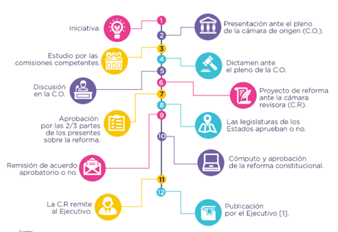 Se trata del conjunto de etapas sistematizadas y ordenadas por la Ley fundamental mexicana, que deberán ser observadas puntualmente por los poderes Legislativo y Ejecutivo para incorporar al sistema jurídico aquellas normas jurídicas de aplicación general y obligatoria conocidas como leyes.