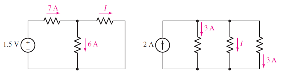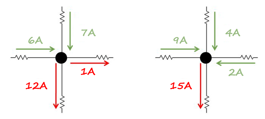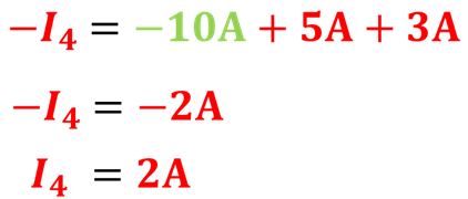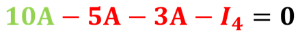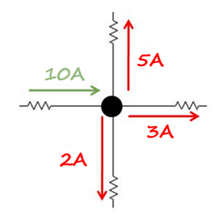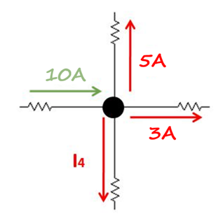 En la imagen podemos observar que hay una corriente de 10 Amperes (verde) que entra y tenemos 3 corrientes que salen (rojas) del nodo. Conocemos el valor de dos corrientes (5A y 3A). Siguiendo la ley de corrientes de Kirchhoff, si entran 10A de corriente, tienen que salir forzosamente 10A de corriente, por lo cual el valor de I4 debe ser 2A. De esta manera la suma de las corrientes que salen también será igual a 10 Amperes.
