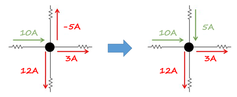 Pero, ¿Qué significa que el signo de la corriente sea negativo? El signo negativo en la corriente solo significa que la corriente tiene la dirección contraria. En el ejemplo de la siguiente imagen podemos ver que hay una corriente que sale del nodo de -5A. El signo menos indica que la corriente no sale del nodo, al contrario entre al nodo.