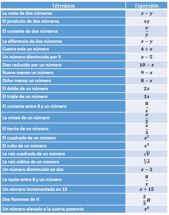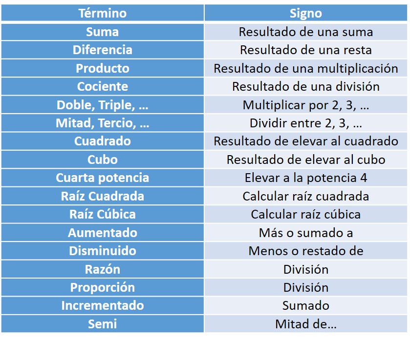 n álgebra, traducir un enunciado a lenguaje algebraico es de suma importancia, por esa razón es necesario conocer algunos términos necesarios para poder hacer una traducción correcta. A continuación, se muestra una tabla con los términos más utilizados y la operación relacionada a estos, así como una tabla con algunos ejemplos.