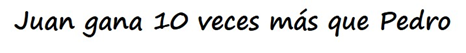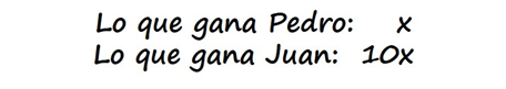 En este enunciado podemos identificar dos cantidades desconocidas: lo que gana Juan y lo que gana Pedro. Pero ambas están relacionadas, ya que nos dice que Juan gana 10 veces más que lo que gana Pedro. Entonces asignemos la letra ‘x’ a la cantidad que gana Pedro. Asignando esto, ¿Cómo expresaríamos lo que gana Juan? Pues muy fácil, tendríamos que multiplicar lo que gana Pedro por 10, que se expresaría como 10x.