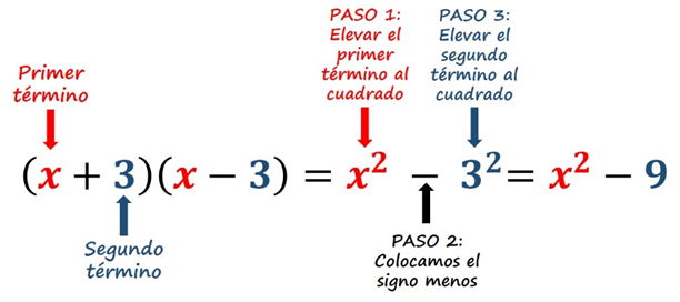 El producto de dos binomios conjugados es igual al primer término al cuadrado menos el segundo término al cuadrado, es decir, una diferencia de cuadrados.