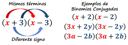 Los binomios conjugados son aquellos que tienen los mismos términos, pero se diferencian solo por un signo en la operación:
